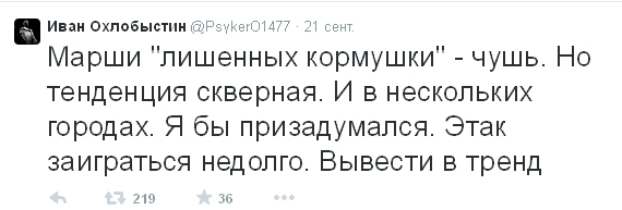 – Марши "лишенных кормушки" – чушь, - написал постфактум Охлобыстин. - Но тенденция скверная. И в нескольких городах. Я бы призадумался. Этак заиграться недолго. Вывести в тренд…