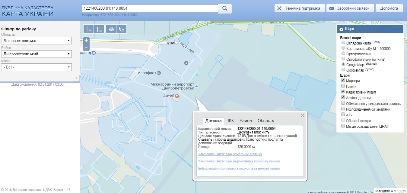 По данным кадастровой карты, земля, на которой расположен аэропорт, принадлежит государству. Участок в 125,0005 га на праве постоянного пользования закреплен за компанией «Дніпроавіа».