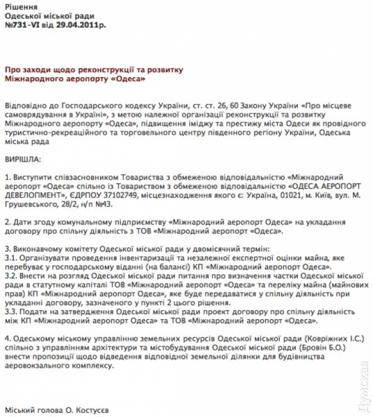 Согласно материалам производства, должностные лица Одесского горсовета (речь идет прежде всего о бывшем мэре Костусеве), вступив в преступный сговор с бизнесменами Борисом Кауфманом и Александром Грановским, реализуя преступные намерения, направленные на завладение коммунальным имуществом, нарушив требования ст. 14 Закона Украины «о государственно-частном партнерстве», без проведения конкурса инициировали и обеспечили принятие Одесским горсоветом решение № 835-VI от 8 июля 2011 года. Согласно этому решению, горсовет и ООО «Одесса аэропорт девелопмент» (учредитель — принадлежащая Кауфману и Грановскому лондонская фирма Odessa airport development Ltd) создали совместное ООО «Международный аэропорт «Одесса» — якобы с целью привлечения инвестиционных средств на сумму 90-102 млн долларов для реконструкции взлетной полосы и терминала.