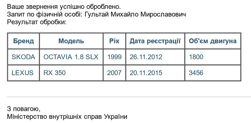 Щодо рухомого майна то в 2015 році суддя придбав собі авто Lexus RX 350 (2007р.в.). Згідно декларації придбав це авто пан Гультай за 149 тис.грн., що в тричі дешевше від ринкової вартості, адже сьогодні подібне авто коштує в середньому 500 тис.грн. Також судді належить авто Skoda Octavia (1999р.в.).