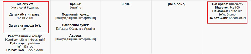 Також, пану Кривенку належить будинок 81кв.м., ½ квартири площею 151,9кв.м., ½ гаража площею 20,40кв.м. та недобудова в с. Мотижин, Київської області.