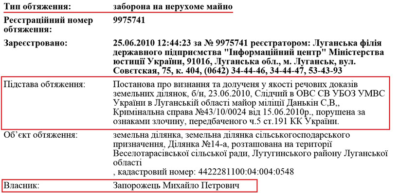 Низку питань викликає майно судді. Так, за даними Реєстру прав на нерухоме майно, судді Запорожцю належать 2 земельні ділянки площею 9.711 та 9.712кв.м., що знаходяться на території Веселотарасівської с/р в Луганській області. На ці ділянки ще у 2010р. Управлінням по боротьбі з організованою злочинністю УМВС України в Луганській області, накладено заборону. Їх було визнано та долучено у якості речових доказів у Кримінальній справі №43/10/0024 від 15.06.2010р., що порушена за ознаками злочину, передбаченого ч.5 ст.191 КК України, а саме: привласнення, розтрата майна або заволодіння ним шляхом зловживання службовим становищем в особливо великих розмірах або організованою групою, - караються позбавленням волі на строк від семи до дванадцяти років з позбавленням права обіймати певні посади чи займатися певною діяльністю на строк до трьох років та з конфіскацією майна.