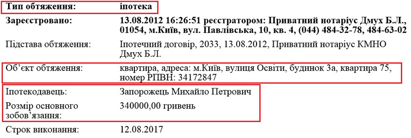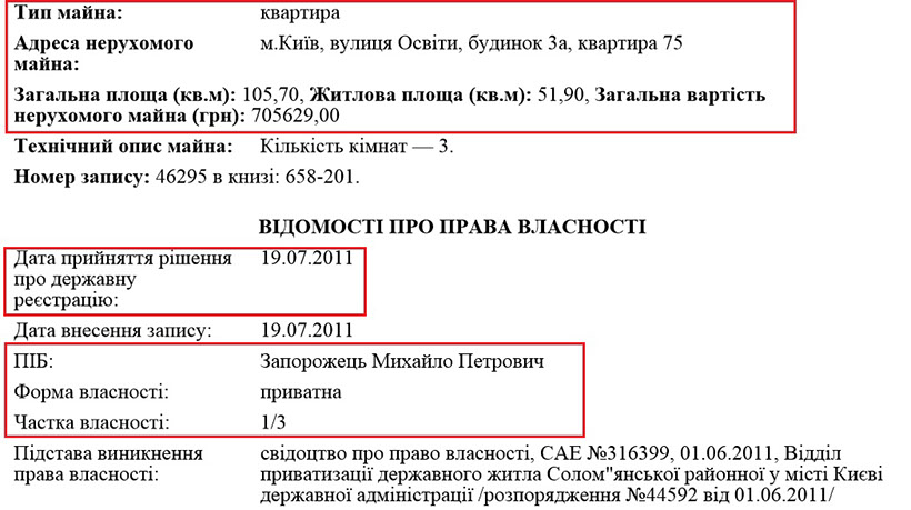 Окрім земельних ділянок пану Запорожцю належить трьох кімнатна квартира в Києві, власником якої він став через рік, після призначення на посаду судді КСУ. 2/3 частини цієї квартири він отримав у власність, на підставі договору дарування. З серпня 2012р. ця нерухомість в іпотеці. Розмір зобов’язання – 340тис.грн.
