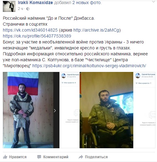 "Российский наемник "До и после Донбасса"… Это бонус за участие в необъявленной войне против Украины. Три ничего не стоящие "медальки", инвалидная коляска", - подписал фото безногого террориста Сергея Новошахтинского блогер.