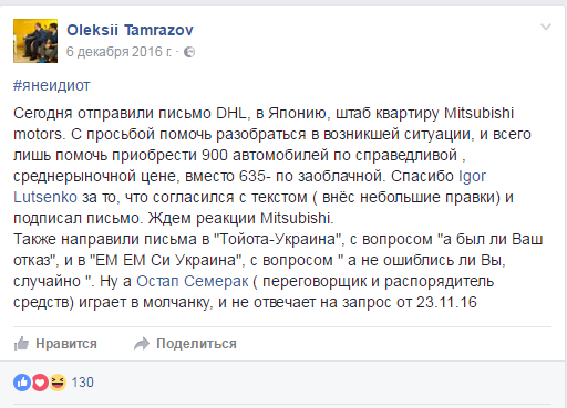 В частности, Тамразов на собственном примере доказал, что стоимость “Мицубиси” для Нацполиции по заключенному договору превышена на почти 14 тысяч долларов. И это без учета скидок за опт и 100%-ную предоплату и лучшей комплектации, нежели для полиции.