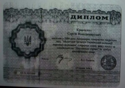 Уже после «института народной медицины» Сергей Кравченко поступил в интернатуру и стал «врачом», это по версии из его биографии. На самом деле, диплома об окончании интернатуры найти так и не удалось. НЕ удивительно, что с такой «квалификацией» в его послужном списке нет ни одной реальной медицинской должности. Через сомнительные титулы вроде «врач-консультант в страховом агентстве» Кравченко сразу пришел к руководству госпредприятиями. Впервые он возглавил госпредприятие во времена Януковича, в 2010 году, и отлично спелся со своими «покровителями». Такое шествие из кабинета в кабинет случайным не бывает. Вот «скромная» выдержка из биографии Кравченко: