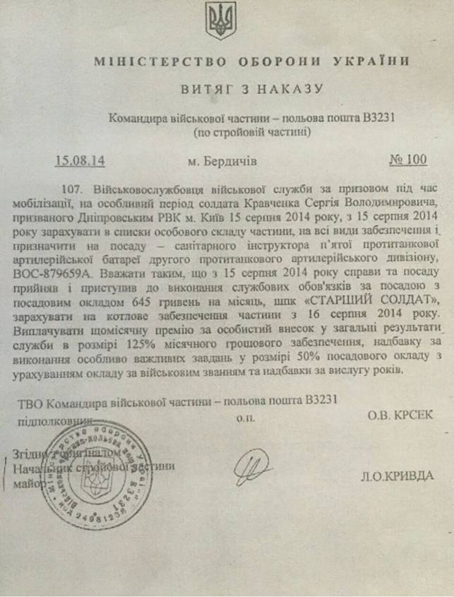 В качестве санинструктора (а вовсе не руководителя подразделения, как он рассказывал в своем интервью), Кравченко отправился проходить службу в Бердичев, подальше от рвущихся мин и снарядов на полях Донбасса. Несмотря на то, что Сергей Кравченко был мобилизован в самое горячее время, в августе 2014 года, он каким-то чудом ухитрился отсидеться в тылу, и только в апреле 2015 года попал в зону АТО. Армейских наград и знаков отличия за свою службу он не получал – что не помешало ему впоследствии их присвоить, о чем речь пойдет ниже.