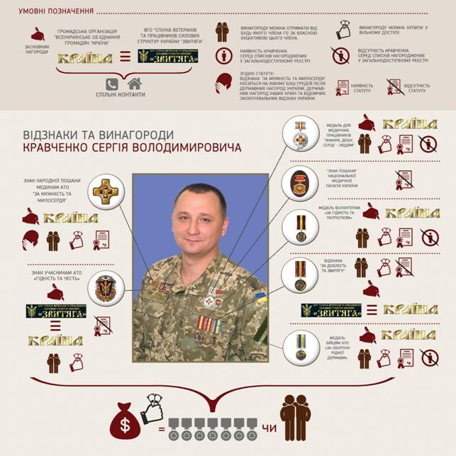 Более того: сам Кравченко тоже постоянно щеголяет фальшивыми медалями и орденами. Для придания себе веса Сергей Кравченко позирует перед камерами в орденах «ВГО «Країна» – лавочки по продаже за 490 гривень медалей, орденов и других наград, которые несведущий человек может спутать с реальными. Цинизм создателей этого «бизнеса» дошел до того, что они разъясняют, как руководитель предприятия может сам себя наградить. Существует психическая болезнь, при которой у человека развивается маниакальная тяга к развешиванию на себе блестящих предметов, похожих на медали и ордена. Весьма вероятно, что тяжелой формой этой болезни страдает и Сергей Кравченко, увешавший себя блестящими медалями по 490 грн на зависть галчонку Хватайке. Мы не поленились подробно разобрать все эти награды, чтобы убедиться, что мы не наговариваем на бойца АТО, а восстанавливаем справедливость и заслуженно клеймим проходимца и афериста. Вот какие награды и ордена носит Кравченко: