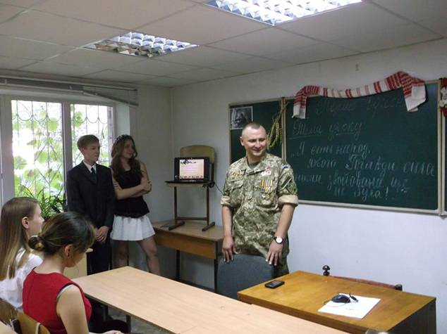 Видимо, логике «не быть, а казаться» и учит подрастающее поколение Сергей Кравченко, проводя открытые уроки в школах. Причем делает он это, конечно, в военной форме, завешанный всеми своими блестящими медальками: