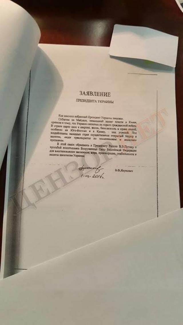 В этой связи обращаюсь к Президенту России В.В. Путину с просьбой использовать Вооруженные силы Российской Федерации для восстановления законности, мира, правопорядка, стабильности и защиты населения Украины». Внизу документа стоит подпись Януковича.