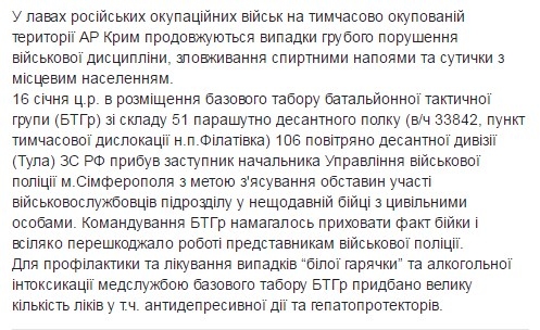 "16 января с.г. в размещение базового лагеря батальонной тактической группы (БТГр) из состава 51 парашютно-десантного полка (в/ч 33842, пункт временной дислокации н.п. Филатовка) 106 воздушно-десантной дивизии (Тула) ВС РФ прибыл заместитель начальника Управления военной полиции Симферополя с целью выяснения обстоятельств участия военнослужащих подразделения в недавней драке с гражданскими лицами", – сказано в сообщении.