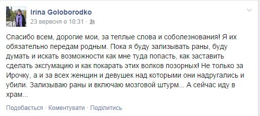 «Только что позвонила подруга из Ясиноватой и с рыданиями сообщила, что ее дочки больше нет. Я познакомилась с ней 22 года назад в поезде, у нее тогда начались роды, и я приняла эту девочку. Ее назвали в мою честь Ириной. С тех пор мы дружим. И вот этой девочки нет! Подруга рассказала, что к ним в квартиру ворвались вооруженные люди и забрали ее насильно, приказав взять с собой паспорт. А вчера им под дверь подбросили ее изувеченный труп», — написала Ирина Голобородько.