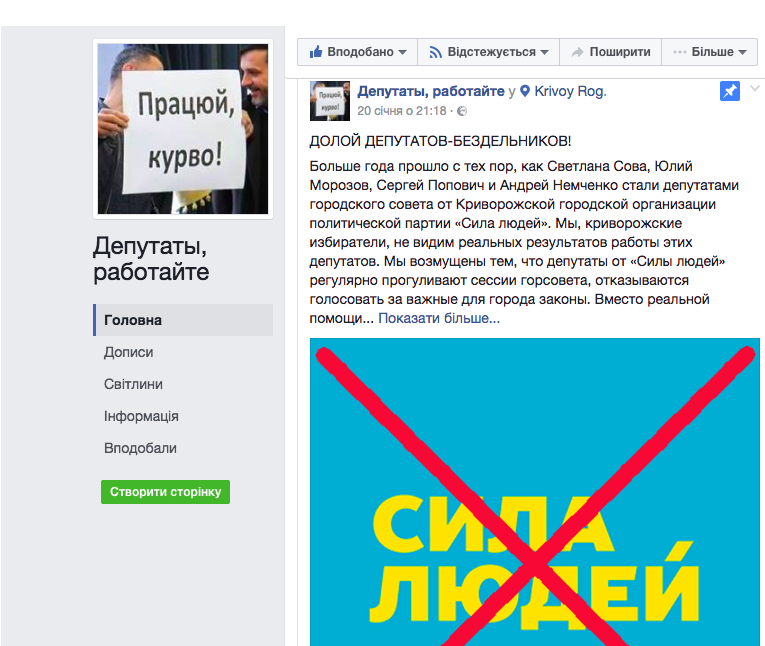 Как отмечается в заявлении инициативной группы, опубликованном на одном из популярных городских пабликов, «мы, криворожские избиратели, не видим реальных результатов работы этих депутатов. Мы возмущены тем, что депутаты от «Силы людей» регулярно прогуливают сессии горсовета, отказываются голосовать за важные для города решения… Последней каплей в чаше терпения криворожан стали так называемые «отчеты о проделанной работе» депутатов от «Силы людей». Они насквозь пропитаны ложью, приписками и очковтирательством. Сова, Морозов, Попович и Немченко откровенно лгут, выдавая плановую работу городских коммунальных служб за собственные «достижения», или приписывают себе то, что сделали депутаты от других партий».