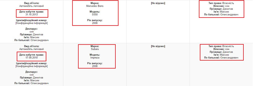 Сину судді належить 2 автомобіля: Mercedes Benz E550 2008 року випуску, вартість якого на сьогодні складає щонайменше 25 000 $ та Subaru Impreza 2008 р.в. вартістю від 10 000 $. До речі, автомобіль Subaru Максим Данилов придбав у віці всього лише 18 років, що іще раз демонструє нам неабиякий талант та успішність сина судді.