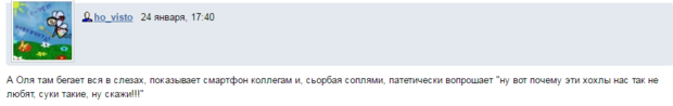 "А Оля там бігає вся в сльозах, показує смартфон колегам і, сьорбаючи соплями, патетично запитує "ну ось чому ці хохли нас так не люблять, с*ки такі, ну скажи", – написав ho_visto.