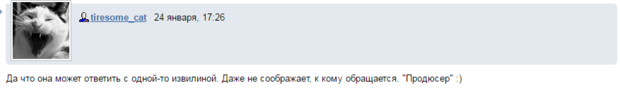 Так що вона може відповісти з однієї-то звилиною. Навіть не тямить, до кого звертається. "Продюсер" – іронічно написав користувач під ніком tiresome_cat.