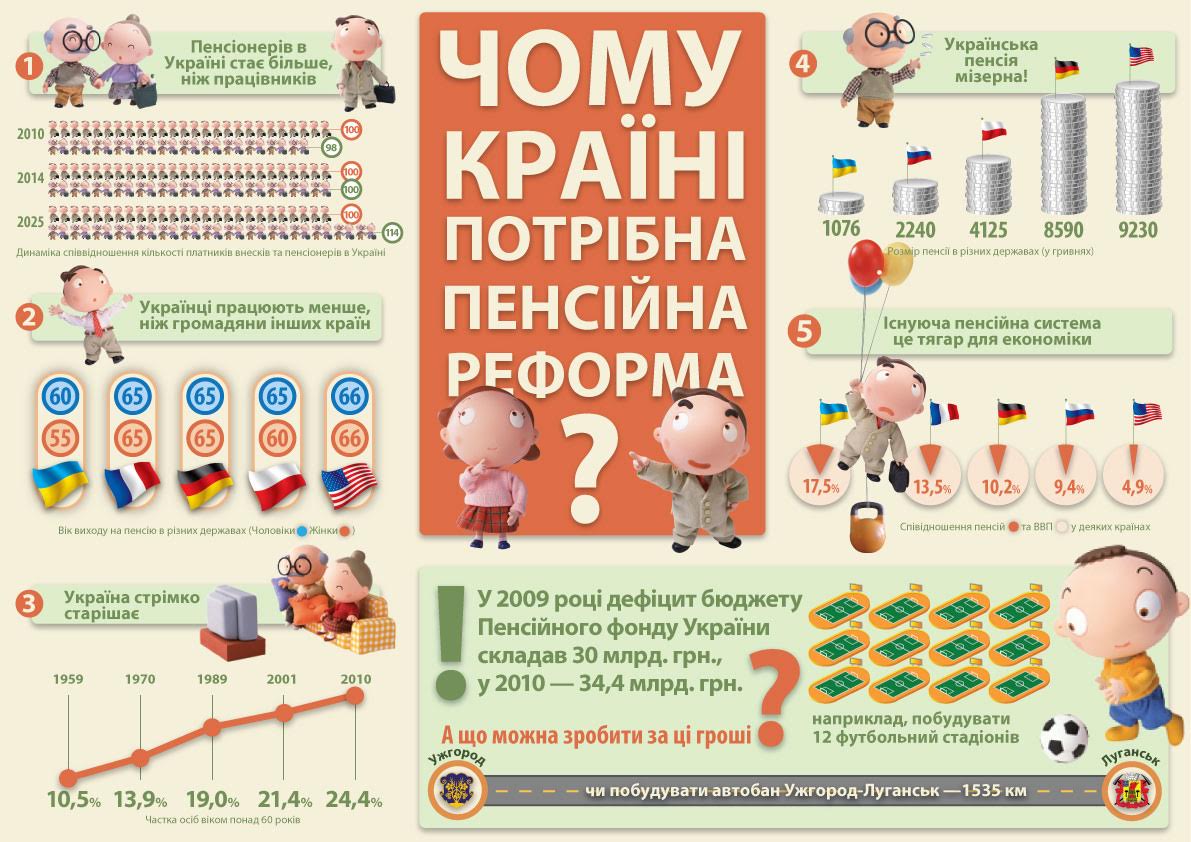 Говорили, что тогдашние реформы были вызваны попыткой выполнения условия МВФ – однако из-за резкого роста социальных протестов правительство Азарова отказалось от дальнейшего сотрудничества с Фондом и начало решать финансовые проблемы выпуском облигаций госзайма. И всё же правительственные агитационные листки того времени утверждали, что сокращение пенсионных расходов не просто необходимо, но и что это просто благо для Украины: мол, на сэкономленные на стариках деньги можно потратить на строительство стадионов или современных шоссе.