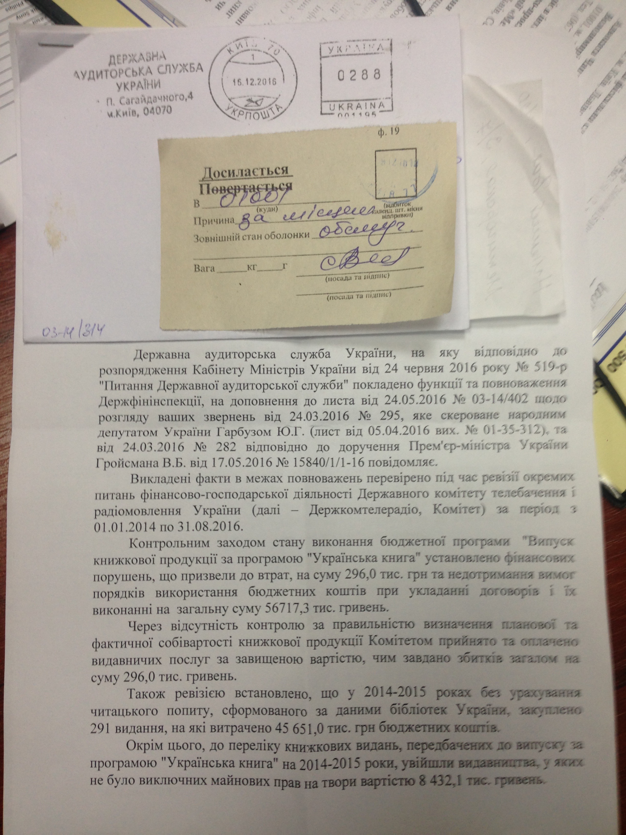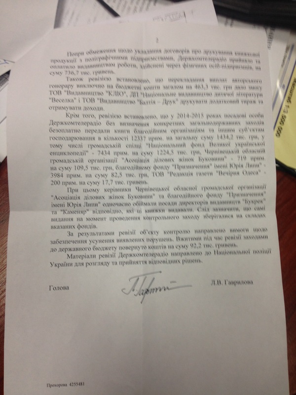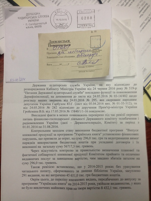 Цікаво, що нещодавно, Державною аудиторською службою України була проведена ревізія фінансово-господарської діяльності Держкомтелерадіо за період з 01.01.2014 року по 31.08.2016 року. В результаті ревізії були виявлені фінансові порушення в напрямку виконання програми "Українська книга", що призвели до втрат, на суму 296 тис. грн. та недоотримання вимог порядків використання бюджетних коштів при укладанні договорів і її виконанні на загальну суму 56717,3 тис грн. А крім того, виявлена ще низка грубих порушень з боку організаторів програми, які носять відверту корупційну ознаку.