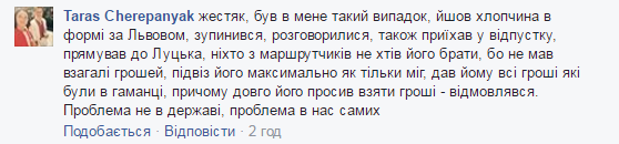"Зупинився. – Тобі куди? – Горохів – Давай наплічник у багажник. Рушаємо далі... Почали спілкуватися, звідки, куди... Додому, у відпустку на пару днів, як сказав він. Із розмови дізнався, що цей хлопець на фронті з 2014 року добровольцем, 4 контузії та купа поранень різної тяжкості, маленька дитина та дружина вдома", – написав Дроздов.
