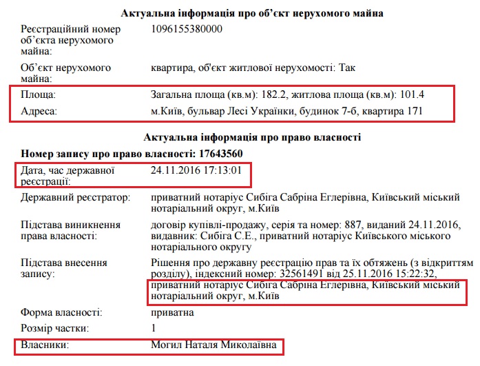 Дружина судді Могила також має нерухомість на Печерську – в 2016 році вона придбала чималу квартиру площею 182 кв.м. в елітному ЖК «Преміум». Вартість квартири такої площі складає щонайменше 355 000 $ або більше 9 млн.грн.