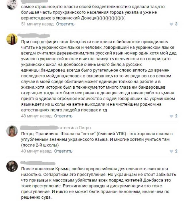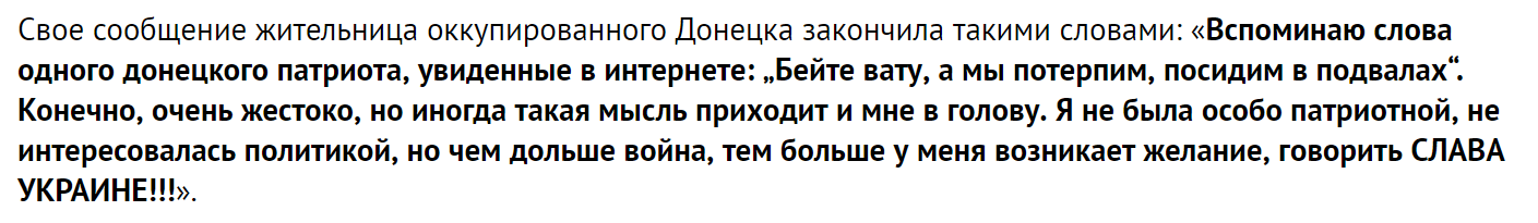 Она отмечает, что не все дончане "отдались в руки" Путину, а также призывает украинцев не отказываться от Донбасса и продолжать бороться за воссоединение страны: "Украина, ребята, родные наши, вы не должны отказываться от нас, должны бороться, пока у нас есть такие люди", — говорится в тексте.