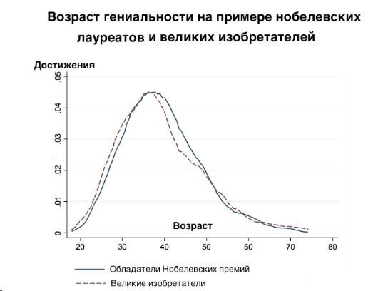 Перше дослідження щодо віку найбільшої продуктивності було проведено ще в 1874 році, проте говорити про якісь істотні результати тоді не довелося. Лише два роки тому, в 2014-му, економісти Бенджамін Джонс з Північно-Західного університету та Брюс Вайнгберг з Університету Огайо проаналізували, на який період життєвого циклу випало найбільше винаходів та відкриттів, які було удостоєно Нобелівської премії, і вирахували «вік геніальності». Вони дослідили дані про 544 нобелівських лауреатів і 286 всесвітньо відомих винахідників 20-го сторіччя та вияснили, що 93% нобелівських та просто важливих відкриттів було здійснено вченими, старшими 26 років. Проте пік продуктивності прийшовся на період між 30 та 40 роками, а середній вік геніальності в минулому столітті становив 39 років. Після 40, згідно з дослідженням експертів, ймовірність зробити щось визначне значно скорочується.
