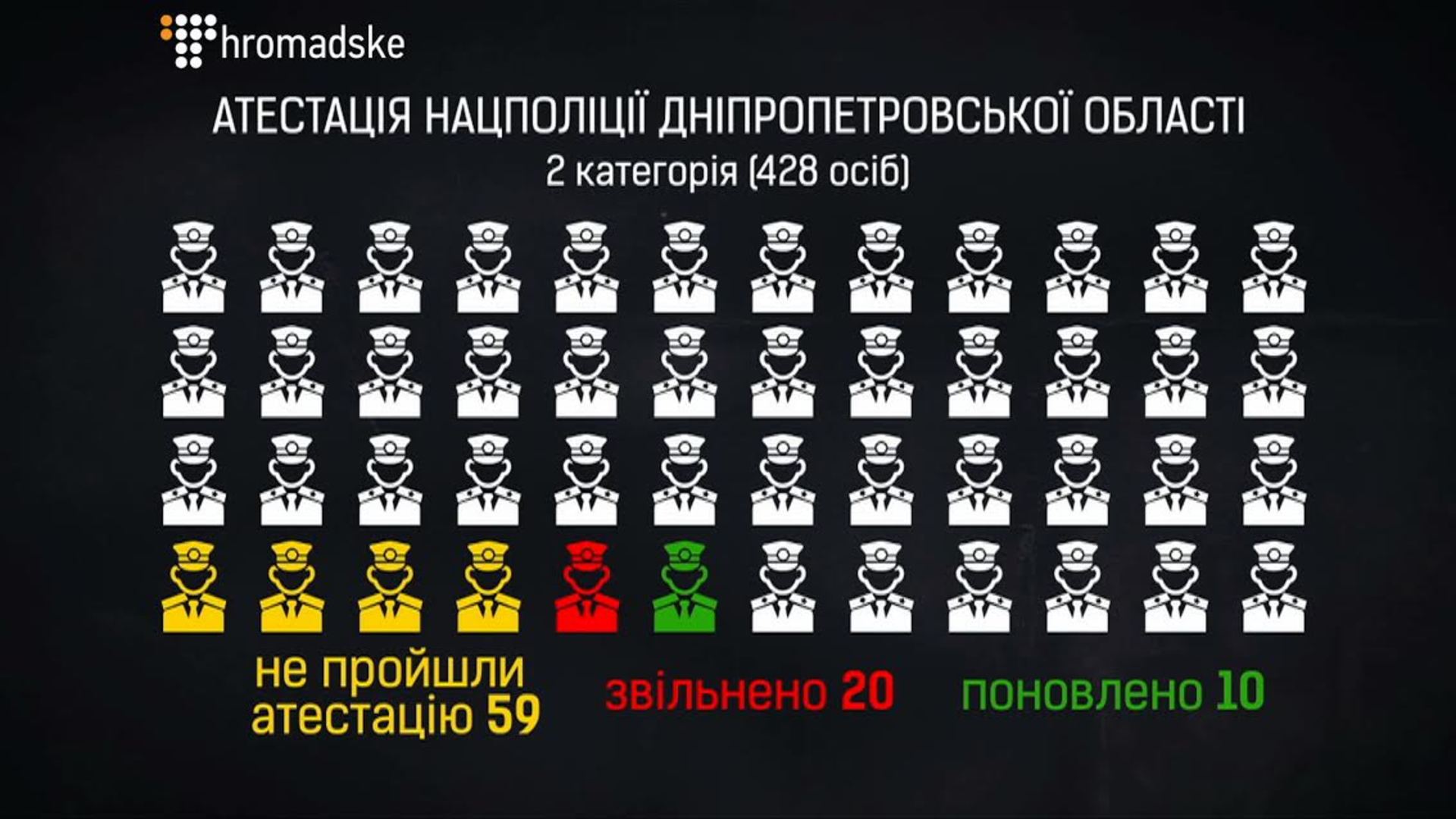 Ось, яку статистику наводять у Нацполіції Дніпропетровської області. Перша категорія, або топове керівництво колишньої міліції: з 57-ми осіб після переатестації звільнено лише 17 людей, з них судом поновлено на посадах – 8.