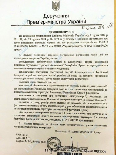Согласно письму, премьер требует объяснить, почему украинская сторона согласилась на прямые поставки Россией электричества на территорию проведения АТО и взяла на себя обязательство оплачивать эти поставки, почему в заключенном контракте предусмотрена фиксированная цена электричества для Крыма, а Россия получила право в одностороннем порядке увеличивать цену электричества для Украины.