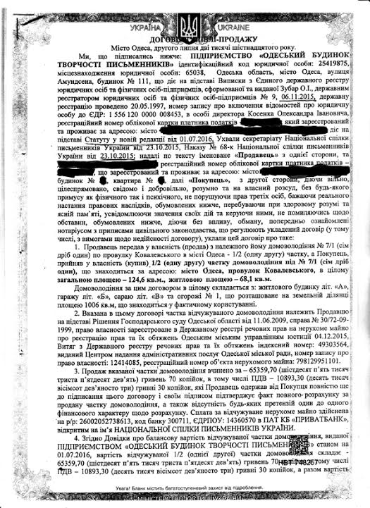По его словам, результатом целого ряда нарушений и злоупотреблений со стороны действующего главы НСПУ стала продажа двух объектов в Одессе: один объект был продан за 24 тыс. грн, второй – за 65 тыс. грн.