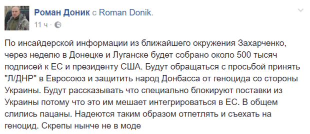 "Вчера и сегодня (за позавчера и раньше не знаю) по учреждениям Донецка ходят птенцы Захарченко из "городской администрации". Собирают подписи на бумажках для Трампа и ЕС, чтоб хунта (то есть мы) перестали геноцидить Донбасс. Цель сбора - 300 тыс подписей", - написал он.