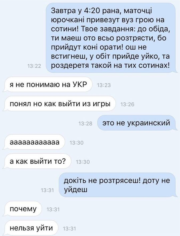 "Скажу сразу, "Вконтакте" заблокують сторінки, якщо ми будемо переписуватися російською. Перше завдання: завтра у 4:20 рана маточці юрочкані привезут вуз грою на сотини! Твоє завдання: до обіда ти маєш ото всьо розтрясти, бо прийдут коні орати! Ош не втигнеш, у обіт прийде уйко, та роздеретя такой на тих сотинах!" – написав Кіт.