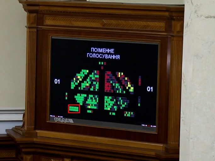 На табло поіменного голосування системи "Рада" видно, що "за" проголосували всі місця заднього ряду БПП, хоча на двох місцях в ньому - між Олександром Урбанським та Вадимом Денисенком - ніхто не сидів.
