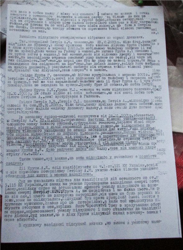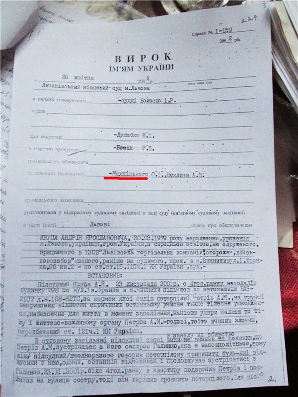 Мирослава Ивановна этой истории не скрывает и охотно демонстрирует все бумаги. Ее сына Андрея Крупу обвинили в том, что он сделала инвалида из насильника сестры – Андрея Петрива. Защищать «пострадавшего» в суде взялся молодой адвокат Олег Махницкий – еще в далеком 2002 году.