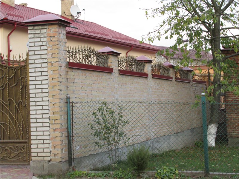 Коттедж в несколько этажей и двор скрывает высокий кирпичный забор.