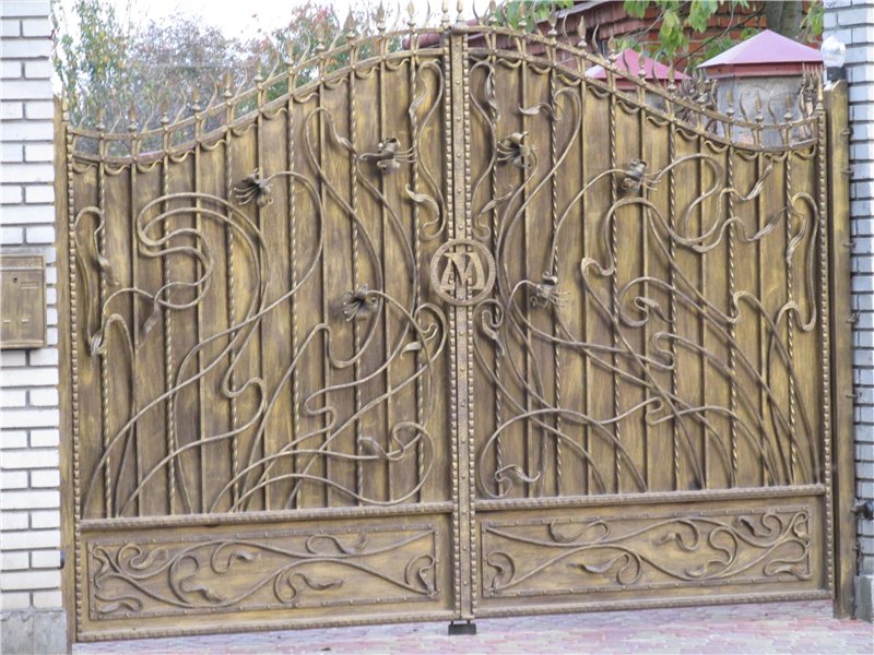 Кованные ворота увенчаны собственным гербом и кованной буквой «М».