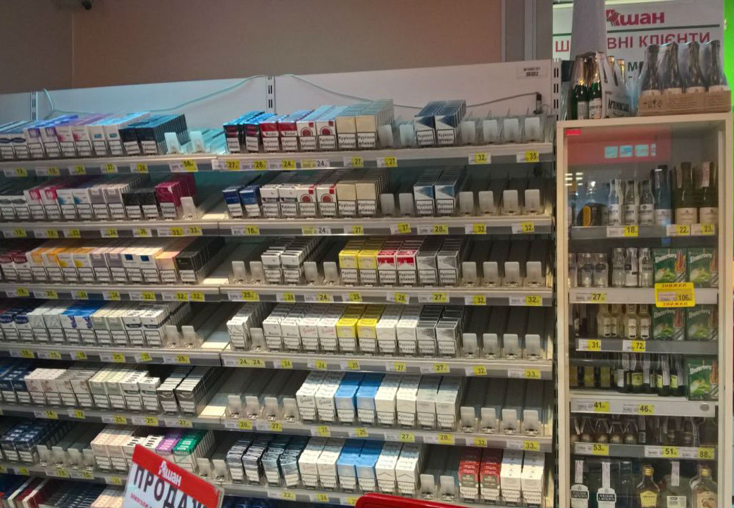 На фото «ОЛИГАРХА»: в магазине «Ашан» (ул.Антоновича, 176) пока сигареты есть, заканчивается только «Parlament», но продавцы уверяют, что новых поставок не будет.