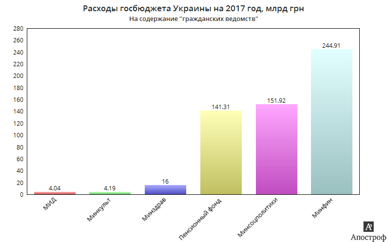 Минфин 1 марта 2017 года указал, что общие расходы на оборону составили 6 млрд 344,9 млн грн (5,74% общего бюджета), а на общественный порядок, безопасность и судебную власть – 9 млрд 13 млн грн (8,15%). Нелишне будет упомянуть, что наши законодатели поглотят 121,3 млн грн, а суды всех инстанций - 110,7 млн грн.