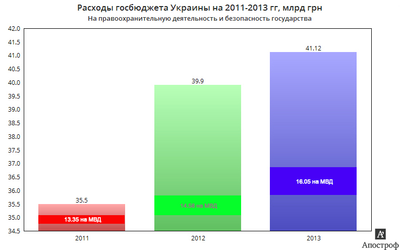 Нельзя не обратить внимания, что общие расходы на безопасность государства превышают издержки ПФ – 141,315 млрд грн. Но самое интересное в том, что наивысший приоритет получило МВД, которое в общей сложности переварит почти половину денег, предназначенных для безопасности – 75,847 млн грн. СБУ с ее бюджетом в 6,5 млрд грн может нервно курить в сторонке и завидовать своим коллегам.