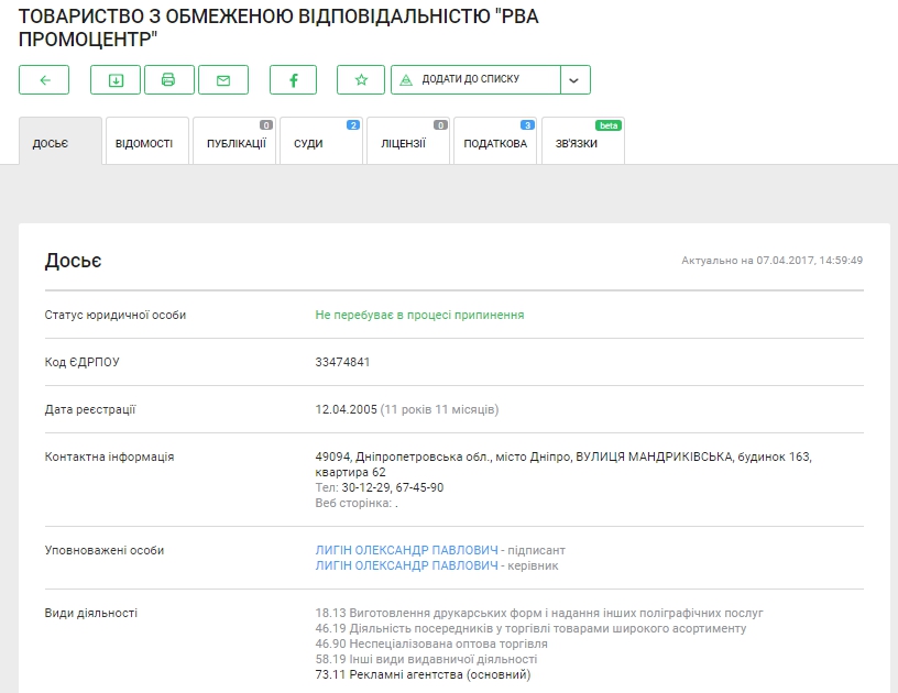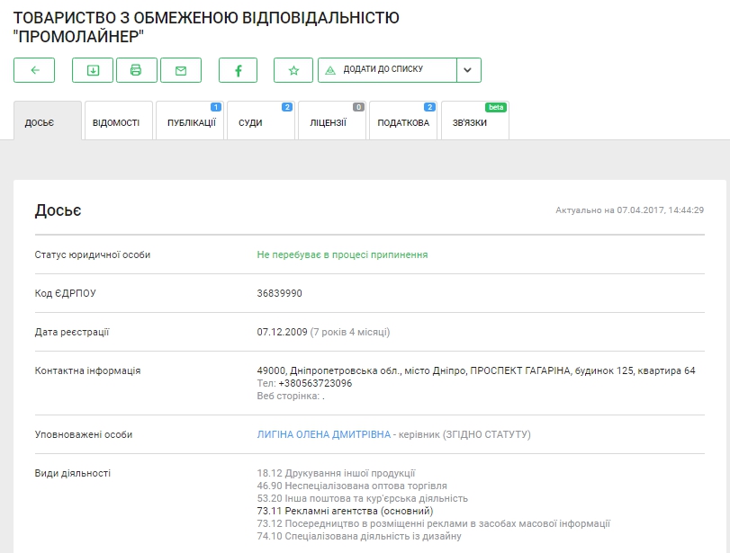 Правда, выборы закончились, и стало не хватать денег на уплату налогов. На 1 марта 2017 года у «ПРОМОЛАЙНЕР» есть налоговый долг – 5 тыс. грн.