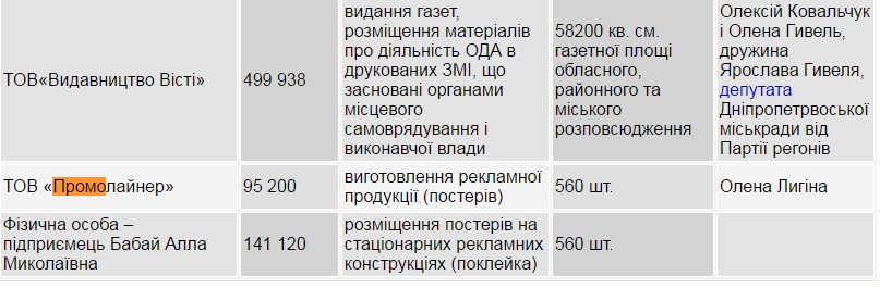 То, что у рекламной фирмы уже были связи с командой бывшего губернатора Игоря Коломойского подтверждает тендер от 4 августа 2014 года на предоставление информационных услуг от департамента информационной деятельности Днепропетровской ОГА. Фирма «Промолайнер» по тендеру получила 95 200 грн на изготовление 560 штук рекламных постеров.