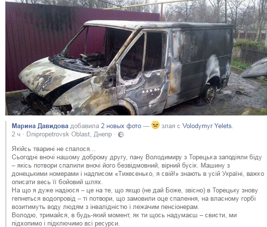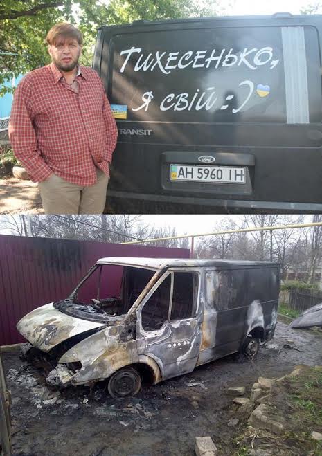 Накануне знаменитый бусик с надписью «Тихесенько, я свій» в очередной раз побывал у военных, которые защищают Торецк. Сама машина, которая прошла 4,500 км по Украине, на которой в город приезжали разные патриотические инициативы, а из города – добрые посылки защитникам Украины – для местных сепаров была что бельмо в глазу.