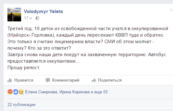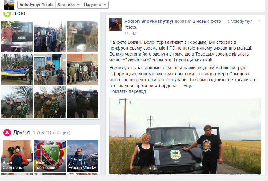 «Я делал в каментах замечания и писал посты о том, что автобусы Торецк — Москва проходят блокпосты без проверок. Как выяснилось, Шапран читает мой Фейсбук и то, что он читает, ему явно не нравится. Он начал выяснять отношения: «Что тебе надо? У меня все лицензии». Я ему ответил: «Лучше б ты флаг повесил над автовокзалом, а то люди приезжают, и не знают, что они в Украине находятся», — говорит Елец, считающий, что о таких «мелочах», как державная символика в городе забывают не случайно: все еще ждут прихода тех, которые из-за поребрика.