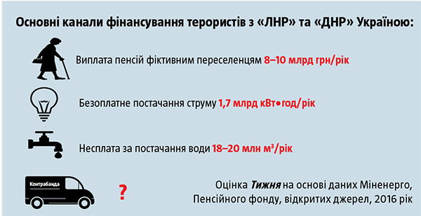Тиждень решил выяснить основные каналы и объемы вливания украинских средств в оккупированные Россией территории Донецкой и Луганской областей, а также механизм изъятия значительной их части в пользу террористических организаций «ДНР» и «ЛНР». Анализ показал, что в результате каких-либо торговых операций, безвозмездной поставки ресурсов или социальных выплат до 40-50% их суммы через разветвленную систему «налогов, сборов и взносов» попадает в так называемых бюджетов «ЛНР» и «ДНР» и становится частью финансирования их террористической деятельности. Если до введения транспортной блокады на государственном уровне Тиждень оценивал совокупный объем финансирования террористов Украиной, по крайней мере, в $1 млрд в год (см. №6/2017),то сейчас он снизился, но менее чем вдвое.