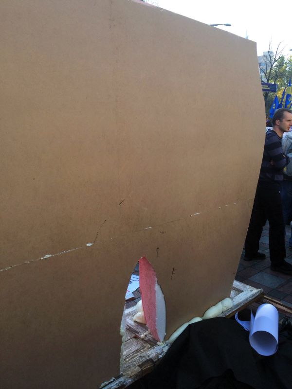 Не знаю, возможно, интеллектуалов покоробит это слово. Но как правдиво описать то, что видел собственными глазами? Жопа она и есть жопа. Данное творчество патриотов из «Свободы», которые собрались со всей области, чтобы продемонстрировать единство все той же нации, вызвало неоднозначное отношение среди самих участников акции. «Шо то означае?», – спросил меня музчина в брутальном камуфляже и ослепительно белых кроссовках. «А х…й его знает», – тактично ответил я, предпочитая не нагружать носителя национальной идеи абсолютно ненужной ему информацией. Тем временем в гигантскую жопу вонзили ножницы, на которых трепыхался некий листок с призывом немедленно принять антикоррупционный закон. Окончательно и, сука, бесповоротно. Следовательно, данный арт-объект символизировал коллективный архетип парламента, погрязшего в коррупции. При этом никого не смущало, что именно данная жопа должна принимать столь долгожданный закон.