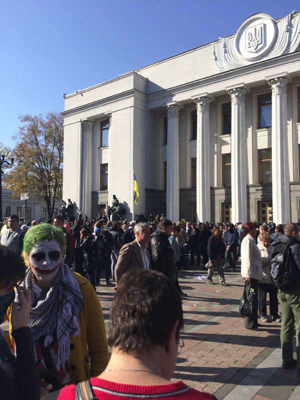 И по свежим следам: «свободовцы» построились в колонну и пошли маршем в направлении Лавры. Под Радой остались «братчики» Корчинского, «куновцы», челы в балаклавах, представители батальона «Азов», вообще не понятно какие люди явно маргинально-агрессивного вида. Они и пытались прорваться к парламенту. Сейчас никакой особой движузи нет. Подтянулись «ляшковцы»,которые жмутся плотной групкой в сторонке. Поют песни про бендеру. В общем, «культурно» проводят время. Все загажено.