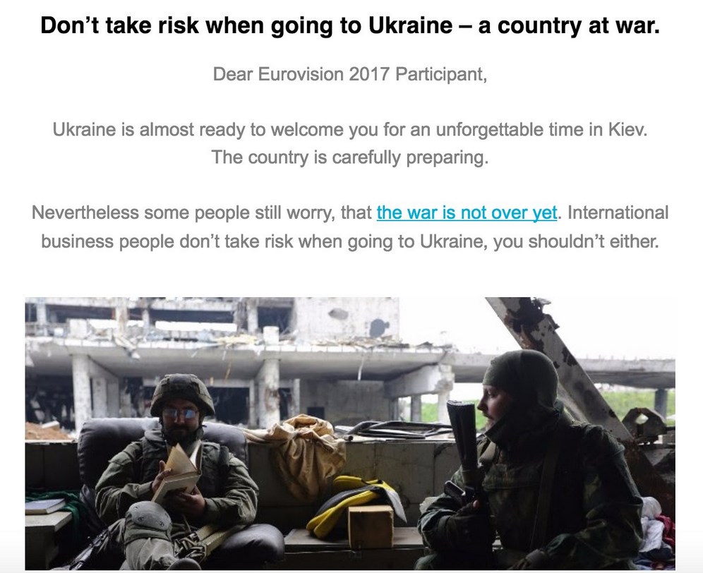 "Не рискуйте, когда отправляетесь на Евровидение в Украину - воюющую страну", гласит заголовок рассылки.