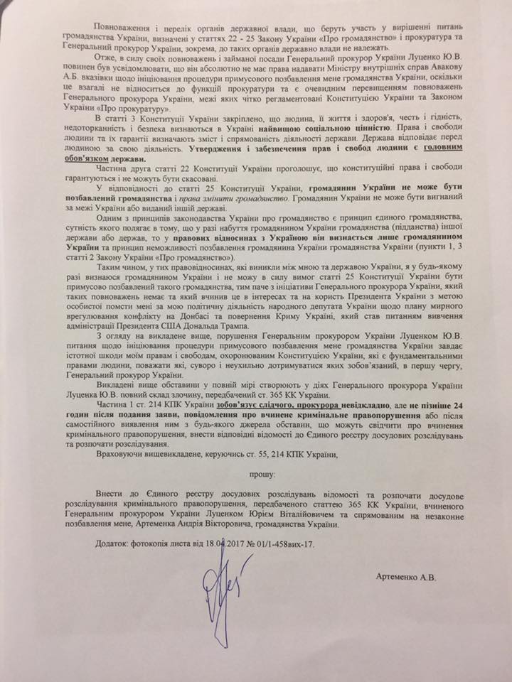 По его словам, он передал персонально главе НАБУ Артему Сытнику заявление, в котором говорится, что обращение генпрокурора Юрия Луценко в адрес главы МВД Авакову с предложением инициировать процедуру лишения депутата гражданства Украины, имеет признаки преступления, предусмотренные статьей 365 УК Украины.