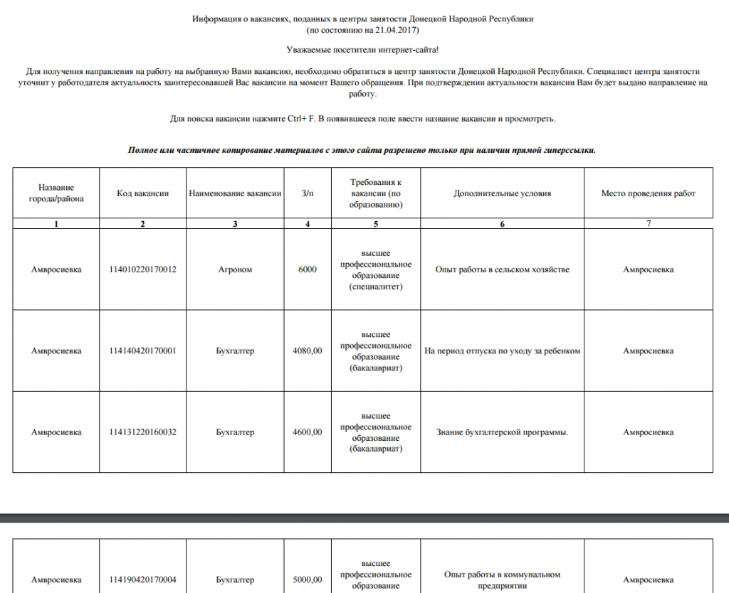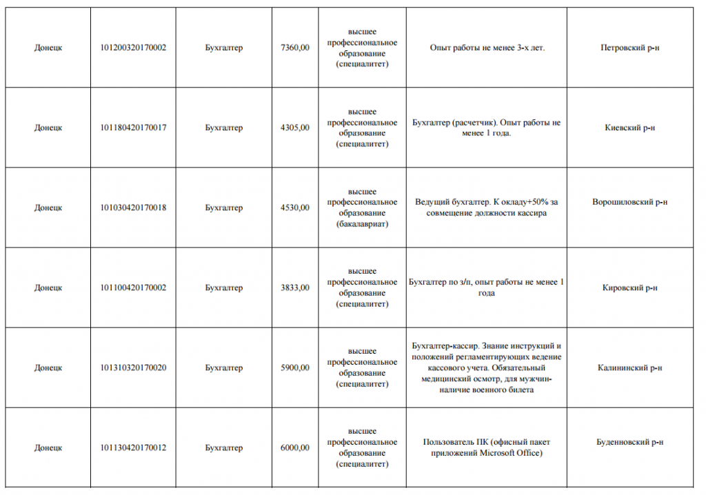 Агроному обещают платить 6000 руб (3000 грн), бухгалтеру — 2000, 2300 и 2500 грн, причем даже на такую зарплату нужен человек исключительно с опытом работы. Одна из самых высоких зарплат в Донецке у асфальтобетонщика — 9441 рубль и директора предприятия — 11491 рубль, водителям предлагают от 3194 до 7850 рублей, врач может претендовать на 9200 рублей.