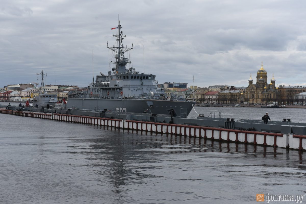 Из шести кораблей отряда у причала остались только тральщики «Александр Обухов» и РТ-57, а также МПК «Зеленодольск». Подводная лодка «Колпино» и малый противолодочный корабль «Уренгой», пришедшие 3 мая, акваторию Невы покинули. По информации издания, МПК «Зеленодольск» и тральщики уйдут из города вечером.