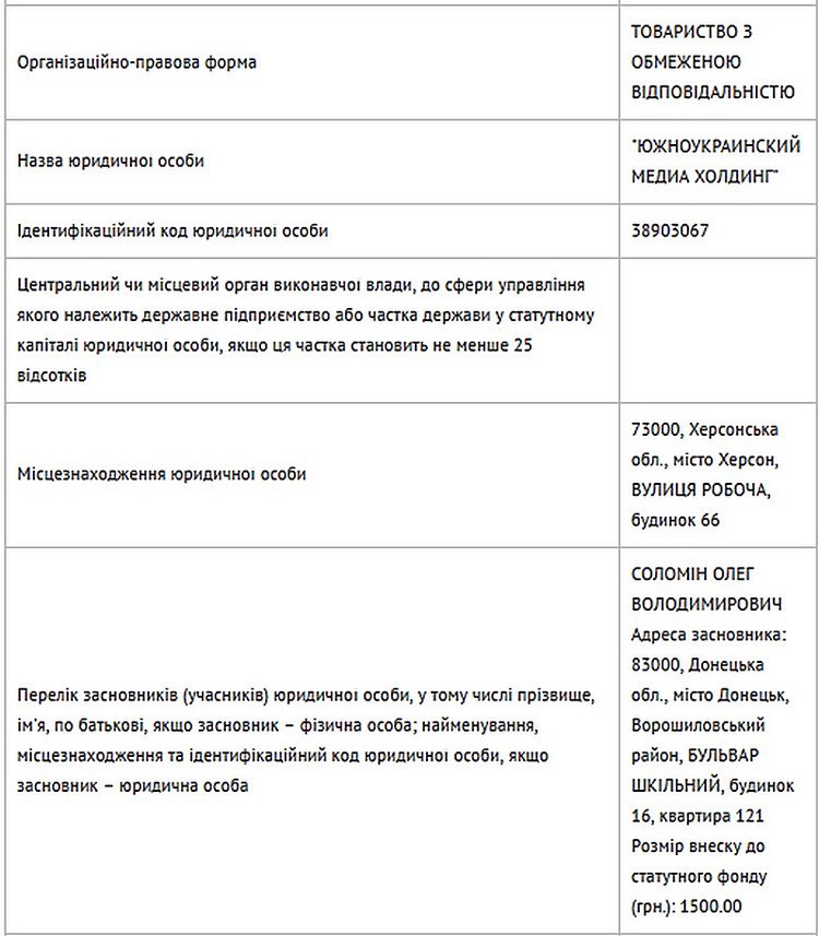 Также отмечается, что ООО «Южноукраинский медиа холдинг» зарегистрировано в Херсоне, его директором является хорошо известный в этом городе общественный деятель и главный редактор интернет-ресурса «Херсонские вести» Игорь Трубаев. Учредитель фирмы – Олег Соломин, проживающий, по данным ЕДР, в Донецке. Уставной капитал холдинга составляет 1,5 тысячи гривен.